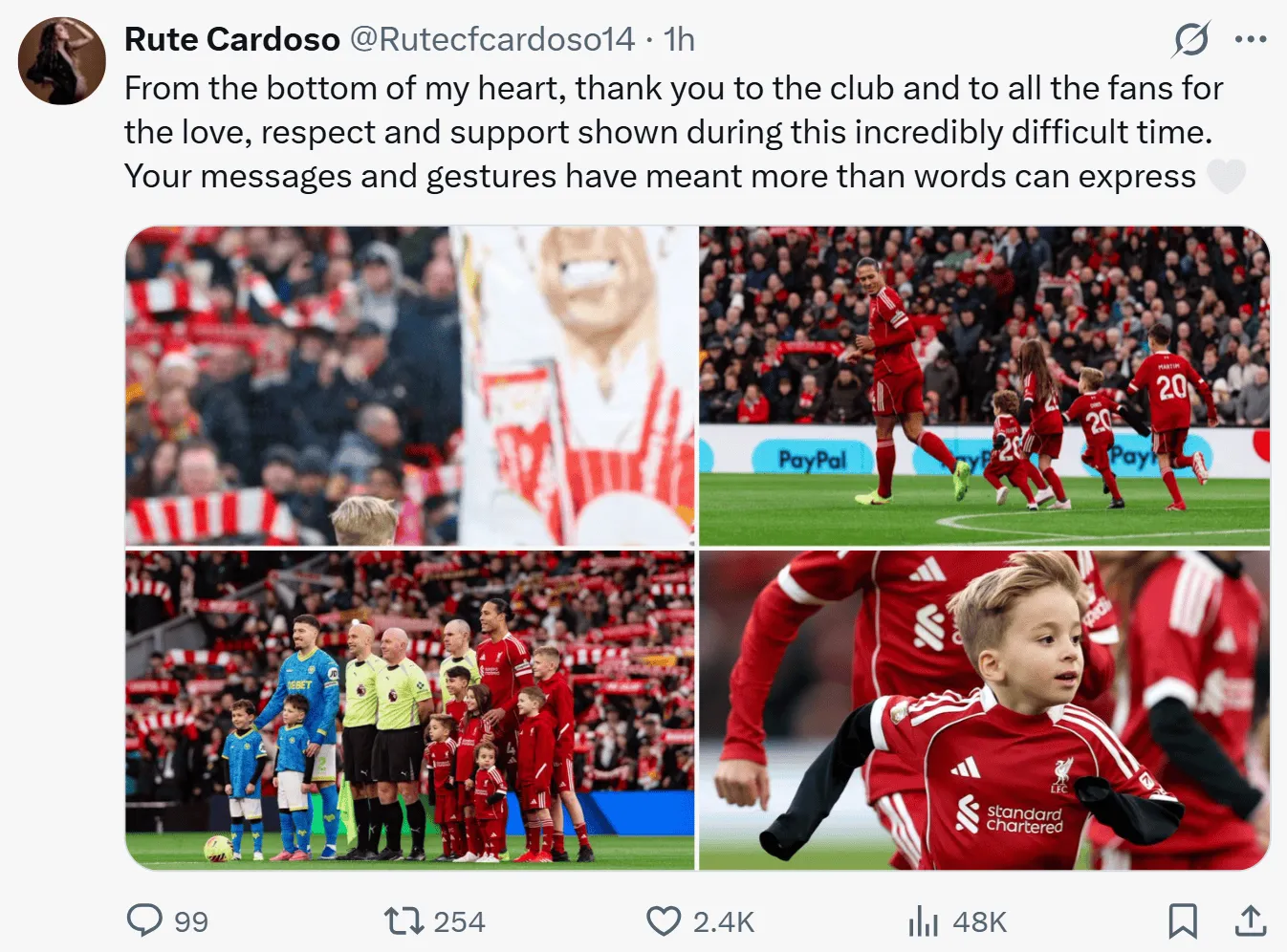 賽后,若塔的妻子Cardoso更新了社交媒體,發(fā)文向大家致謝。她的社媒配文這樣寫道:“謹(jǐn)以此心,感謝利物浦俱樂部以及所有球迷——在這段異常艱難的日子里,你們給予我的關(guān)愛、尊重與支持,我牢記于心。你們發(fā)來的每一條訊息、付出的每一份心意,都難以用言語形容其分量?!?/p>來源:X