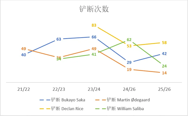 薩卡 與 萊斯的鏟斷數(shù)據(jù)仍有提升,防守積極十足,另外右邊衛(wèi) 廷貝爾也是出眾的斷球者。
