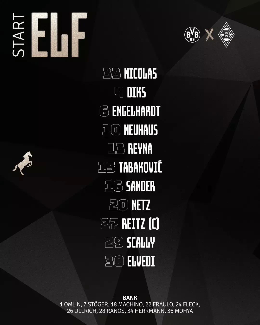 門興首發(fā):33-尼古拉斯、4-迪克斯、6-恩格哈特、10-諾伊豪斯、13-雷納、15-塔巴科維奇、16-桑德、20-內(nèi)茨、27-賴茨、29-斯凱利、30-埃爾維迪