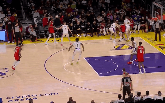 比賽第四節(jié),全替湖人大比分落后,板投補陣?yán)椎峡伺沙隽巳嫜a陣容:克內(nèi)克特、阿杜-蒂耶羅、布朗尼、克勒貝爾、拉拉維亞。