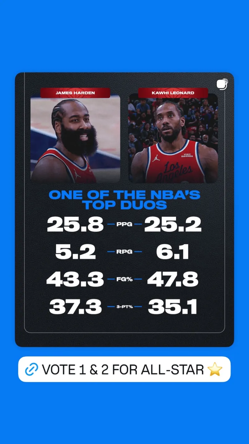 [流言板]快船官方曬哈登和倫納德場(chǎng)均數(shù)據(jù):聯(lián)盟最出色雙人組之一!