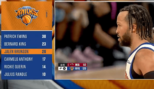 比賽的板布第四節(jié),布倫森已經(jīng)砍下42分,尼克尼克斯生涯第20次單場得到40+得分,斯生史僅轉(zhuǎn)播畫面給出了尼克斯隊史拿到40+得分場次的涯第尤因球員排名,詳情如下: