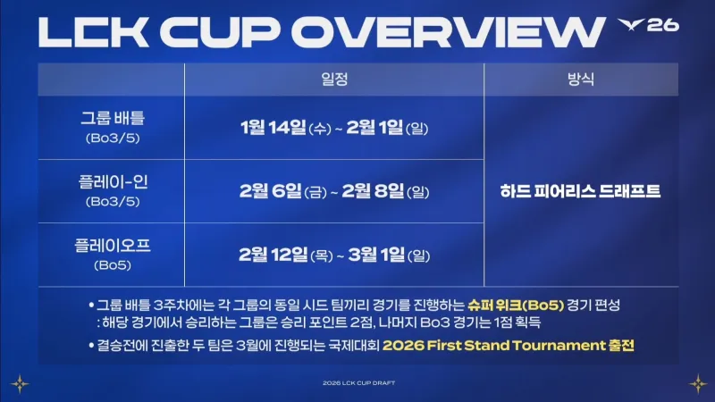 虎撲01月06日訊 今日2026LCK CUP賽制已公布,相較于2025LCK CUP有所改動,新增具體如下: