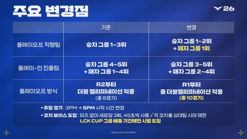 教練開麥(Coach Voice)試點引入:每局比賽可使用3次,每次最長45秒,無懲罰限制。使用時,對方教練的視野畫面將受到限制。此功能將僅在LCK杯小組對抗賽期間進行試點引入。