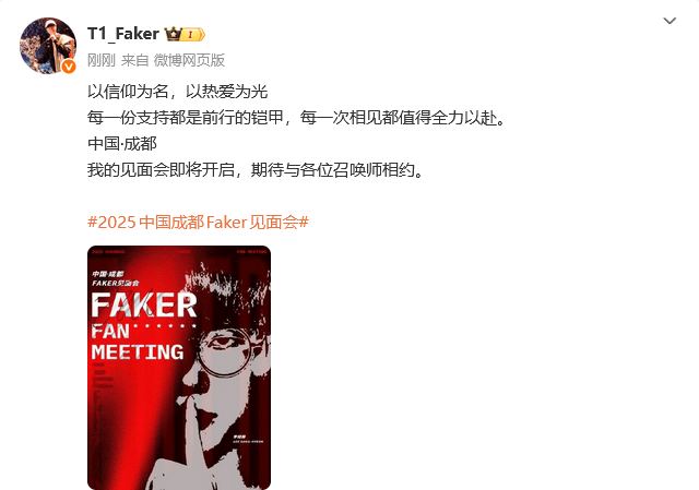 [流言板]Faker社媒發(fā)文:我的見面會即將開啟,期待與各位相約成都
