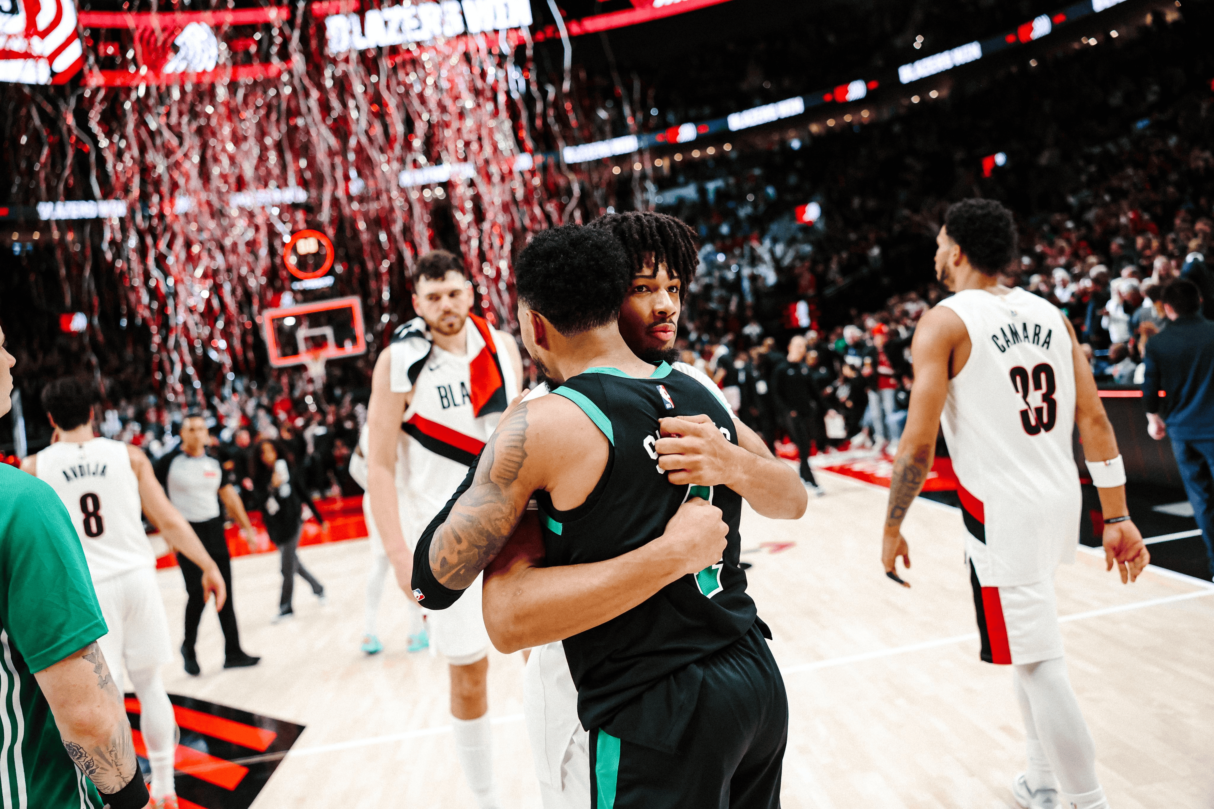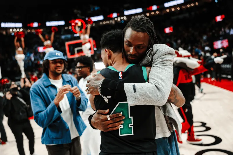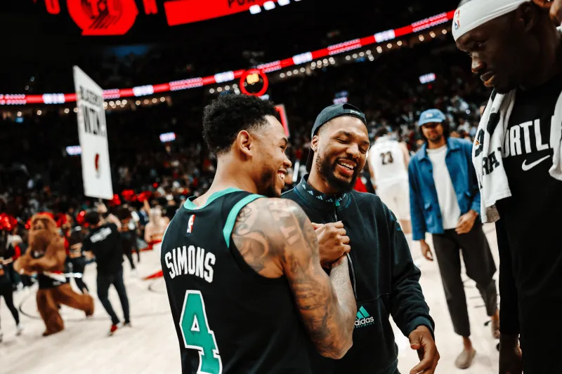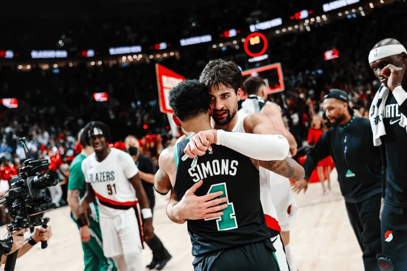 開拓者官方曬出全隊賽后和安芬尼-西蒙斯擁抱照:精彩的高興比賽,很高興見到你。板開比賽