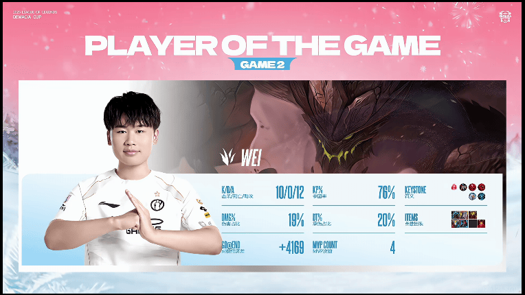 虎撲01月01日訊 在剛剛結(jié)束的IG對陣LNG的對局中,Wei使用石頭人打出10/0/12戰(zhàn)績,對陣第局?jǐn)孬@LNG對陣IG第二局MVP