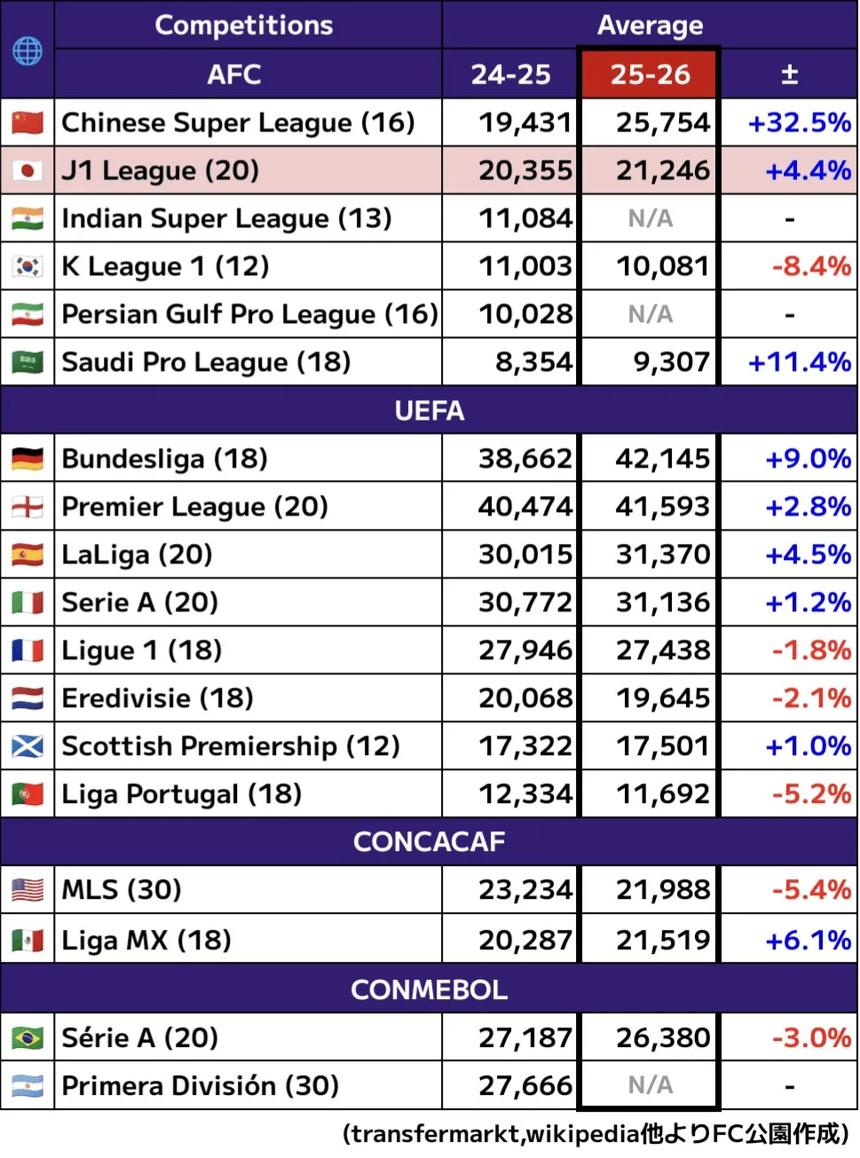 同時該博主還統(tǒng)計了亞洲、歐洲、美洲主要聯(lián)賽的上座情況。中超和J1呈現(xiàn)增幅,而K1聯(lián)賽則繼續(xù)下行。