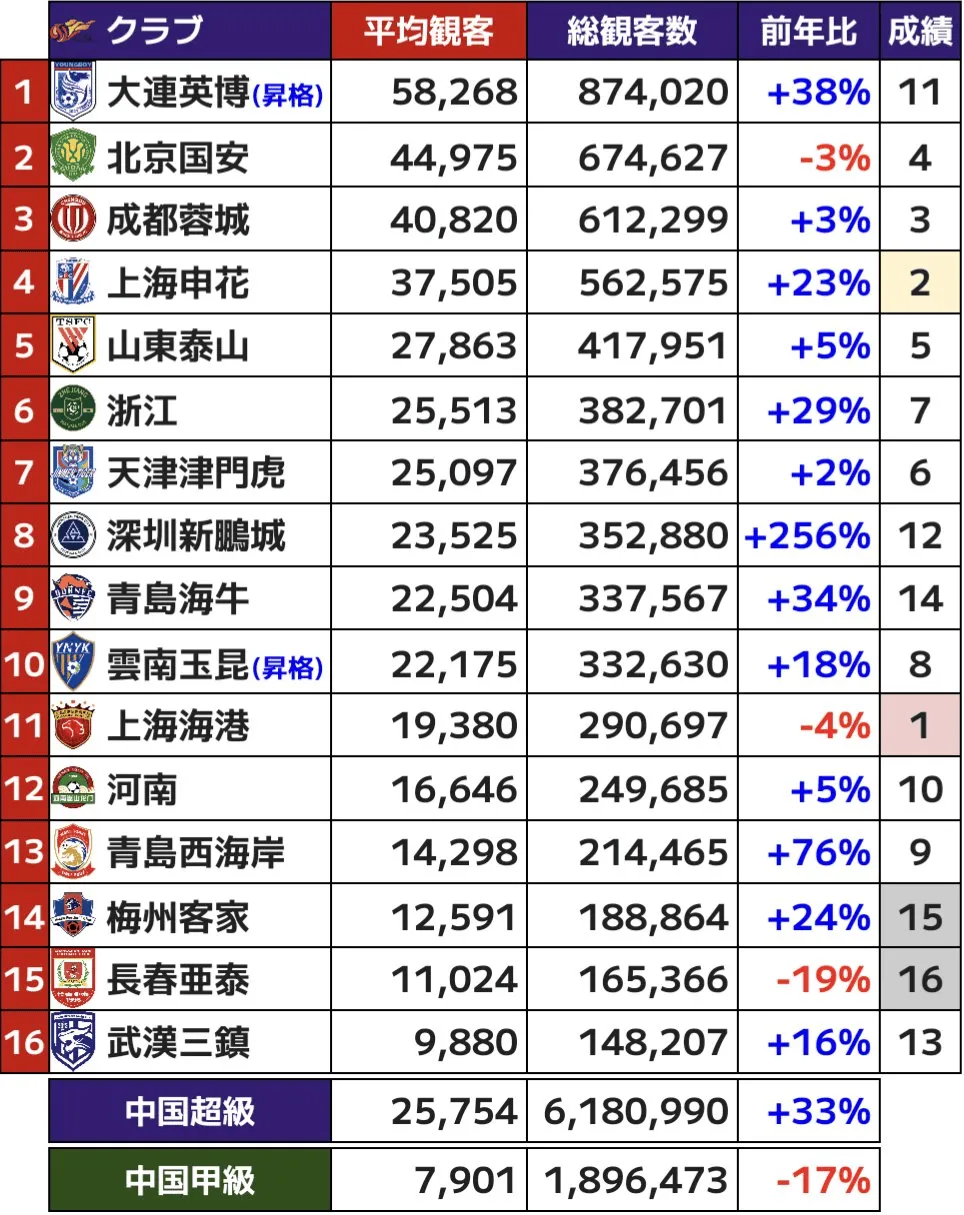 2025賽季中超聯(lián)賽平均入場觀眾數(shù)為25754人,相比較2024賽季上漲了33%。其中中超升班馬大連英博以場均58268人位列中超榜首,相比2024年的中甲賽季增幅為38%。而深圳新鵬城則是增幅最大,相比較2024賽季上漲了256%,場均23525人。而中超聯(lián)賽本賽季只有北京國安、上海海港和長春亞泰三支隊伍的場均上座人數(shù)是比2024賽季要少的。