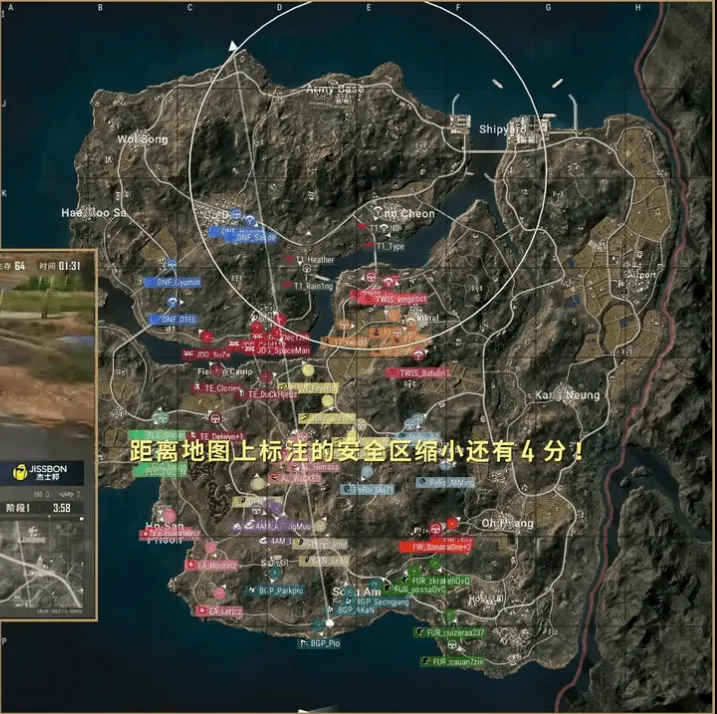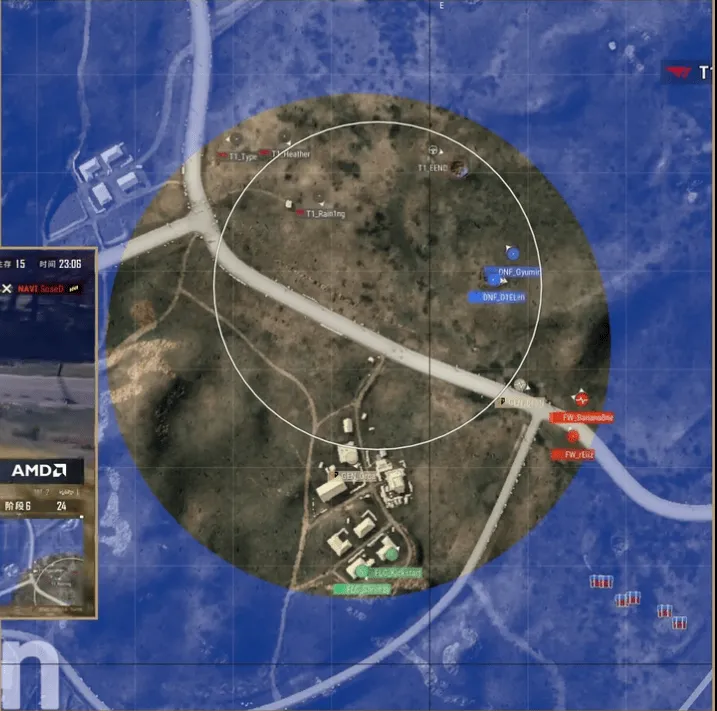 階段6,F(xiàn)W向圈內(nèi)轉(zhuǎn)移,但被DNF使用道具淘汰兩人,另外一邊GEN獨狼也被T1連狙淘汰。