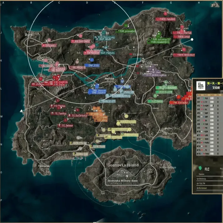 決賽圈,圈型北切,17主動拉出淘汰JDG一人,但自身也被TWIS摸掉一人,TWIS獨狼也被藍圈淘汰。最終剩余FLC4打3 17,F(xiàn)LC利用裝甲車先占據(jù)圈內(nèi)優(yōu)勢位置,17三人無處可去被淘汰,F(xiàn)LC成功吃雞。