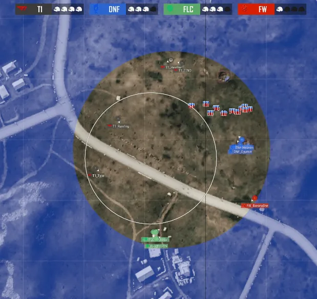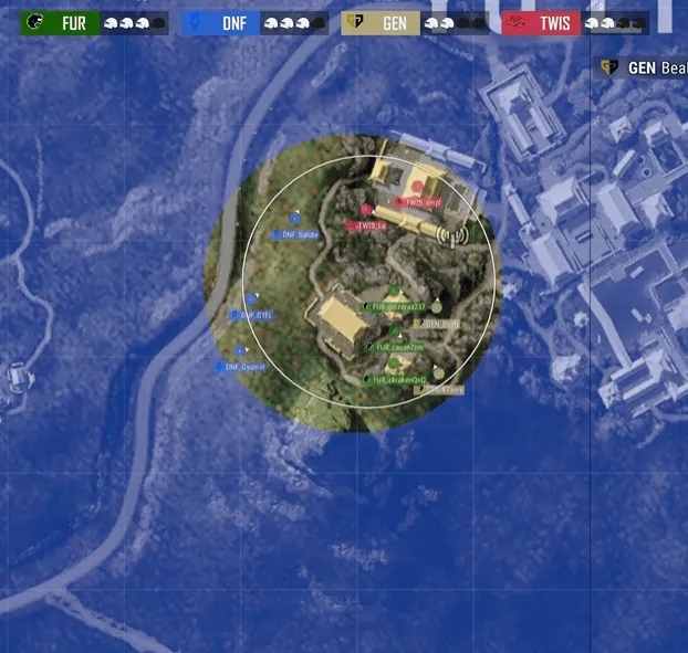 階段6,圈型刷到靶場南部雙房附近,4AM開車撞擊FLC方向,但被FLC打掉兩人,另外一邊DNF與GEN交戰(zhàn),TWIS趕來交戰(zhàn),DNF先被淘汰出局,隨后GEN兩人也無處可去被藍圈帶走。