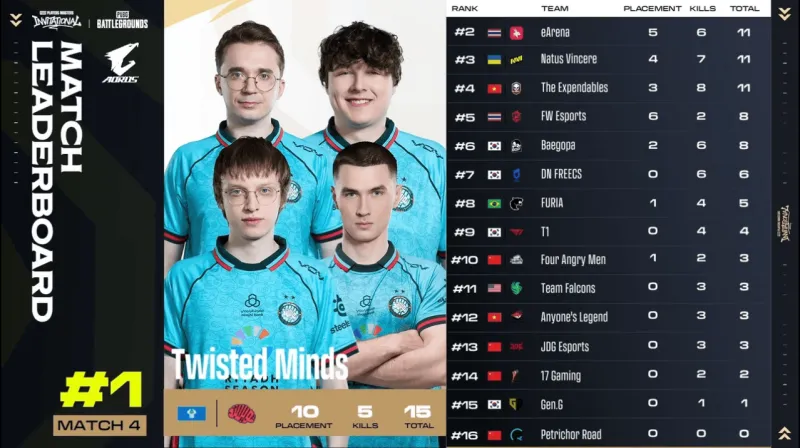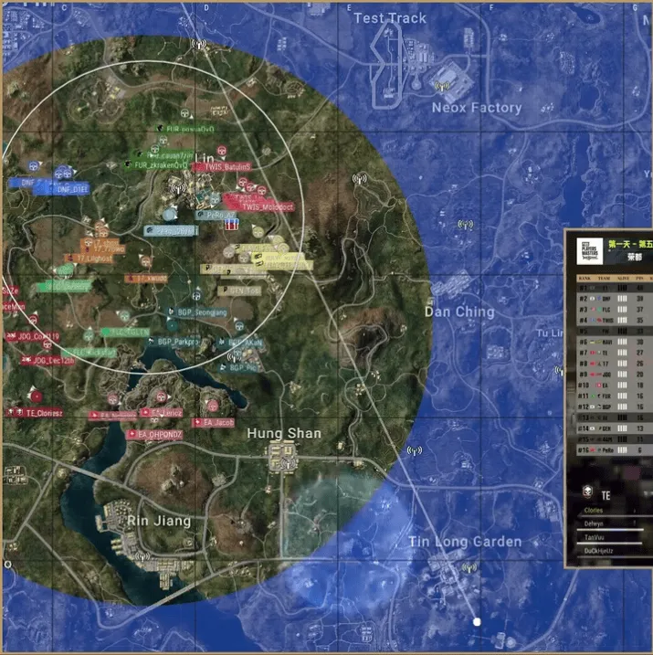 決賽圈,TE獨狼先被EA淘汰,隨后NAVI獨狼也被FW清理,F(xiàn)W控制圈內(nèi)大部分地形,隨后TWIS四打三FW,階段9,TWIS利用手雷打開突破口,隨后大舉壓上將FW淘汰,TWIS成功吃雞。
