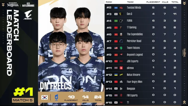 決賽圈,GEN先摸掉FUR一人。梅花樁刷新,DNF、GEN、FUR三隊混戰(zhàn),GEN兩人先被淘汰,隨后FUR也被淘汰,最終DNF將TWIS最后一人打掉成功吃雞。