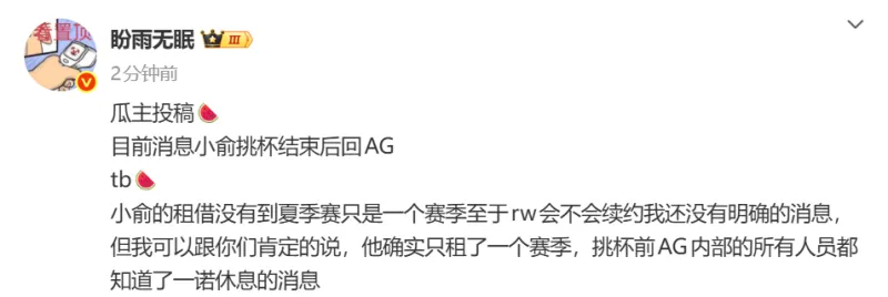瓜主爆料,目前消息小俞挑杯結束后回AG,挑杯他確實只租了一個賽季
