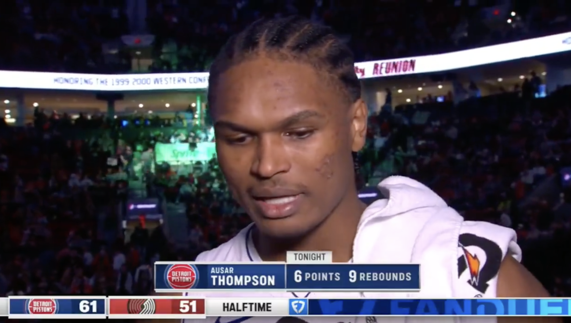 中場結(jié)束時活塞球員奧薩爾-湯普森接受了記者采訪。入犯