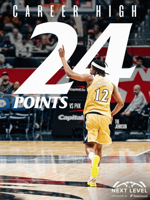 本場比賽,涯之夜特奇才球員6號秀特雷-約翰遜出戰(zhàn)25分鐘,12投9中,其中三分球5投5中,罰球1投1中,得到24分1籃板2助攻1搶斷。