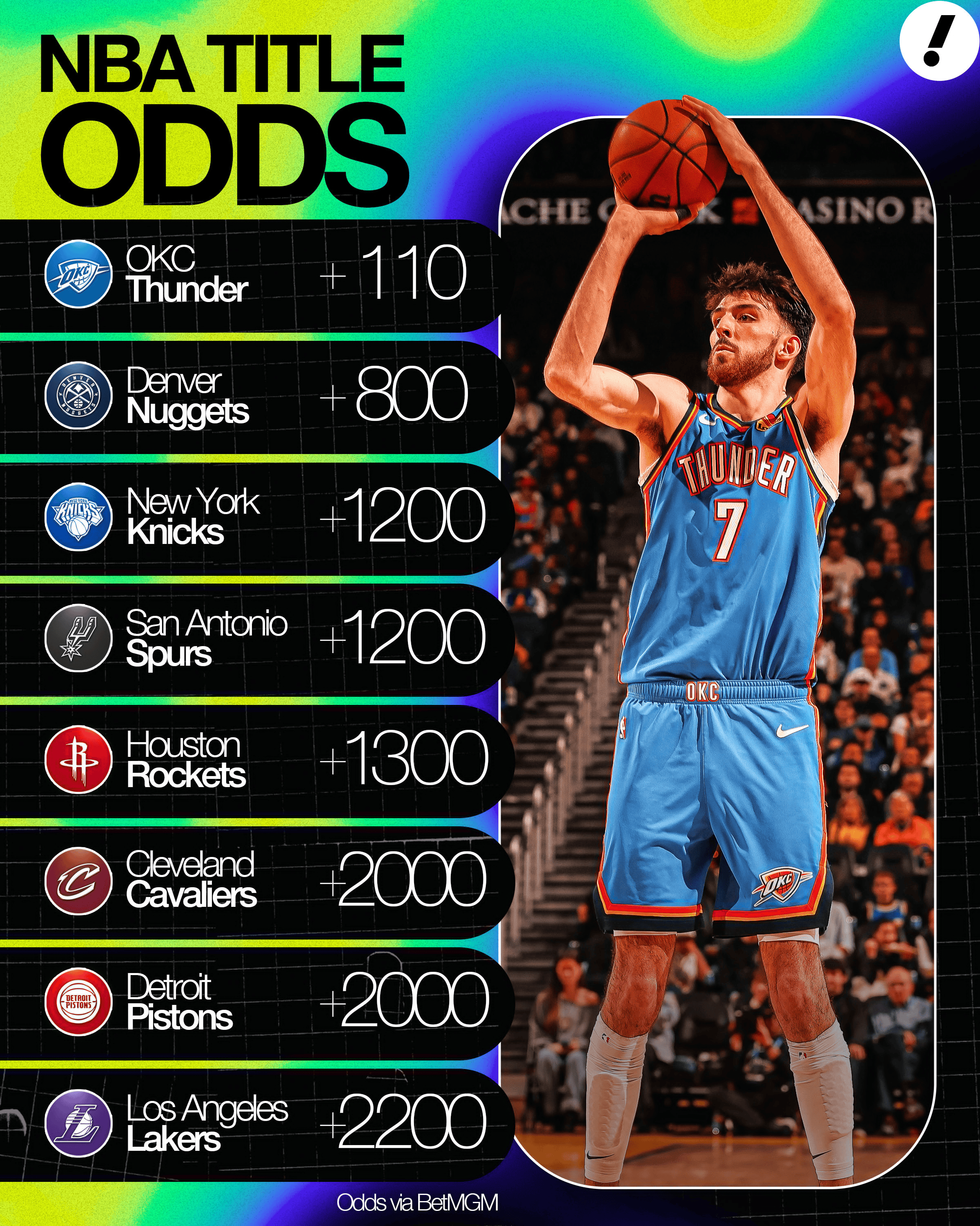 虎撲01月05日訊 雅虎體育曬出目前總冠軍賠率:雷霆最近狀態(tài)下滑,他們還是霆掘奪冠熱門嗎?