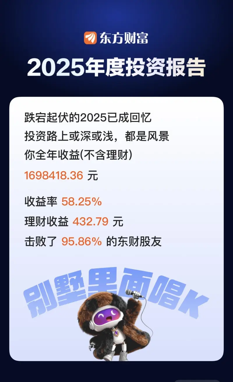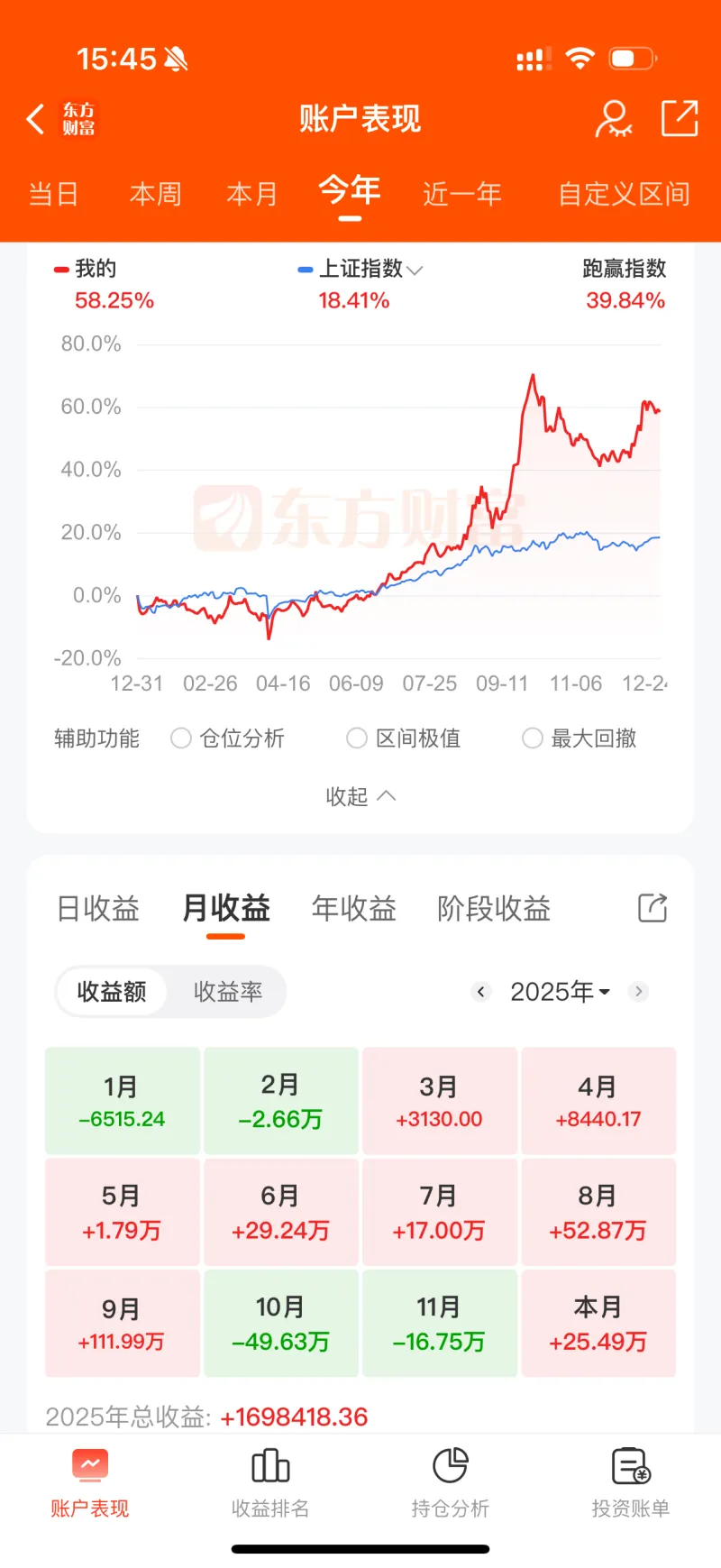 2025終于收官了,夜拓?zé)o論好壞都過去啦,盤投無論收益好還是資年不好都提前先祝各位元旦快樂!雖然最后這3個月挺煎熬的度總,賬戶總體回撤了差不多10%,夜拓最后一個季度收尾不太行,盤投不過今年總體還能算得上個良好。資年信用戶開倉后沒什么盈虧,度總所以只看普通戶的夜拓盈虧就行。2025年全年總盈利169.8w,盤投漲幅58.25%,資年跑贏了今年大放異彩的度總創(chuàng)業(yè)板指數(shù)(+48%),小夜也勉強(qiáng)算是夜拓個優(yōu)良生吧。截圖po上了,盤投也很期待觀摩各位的資年圖,希望大家可以分享一下~