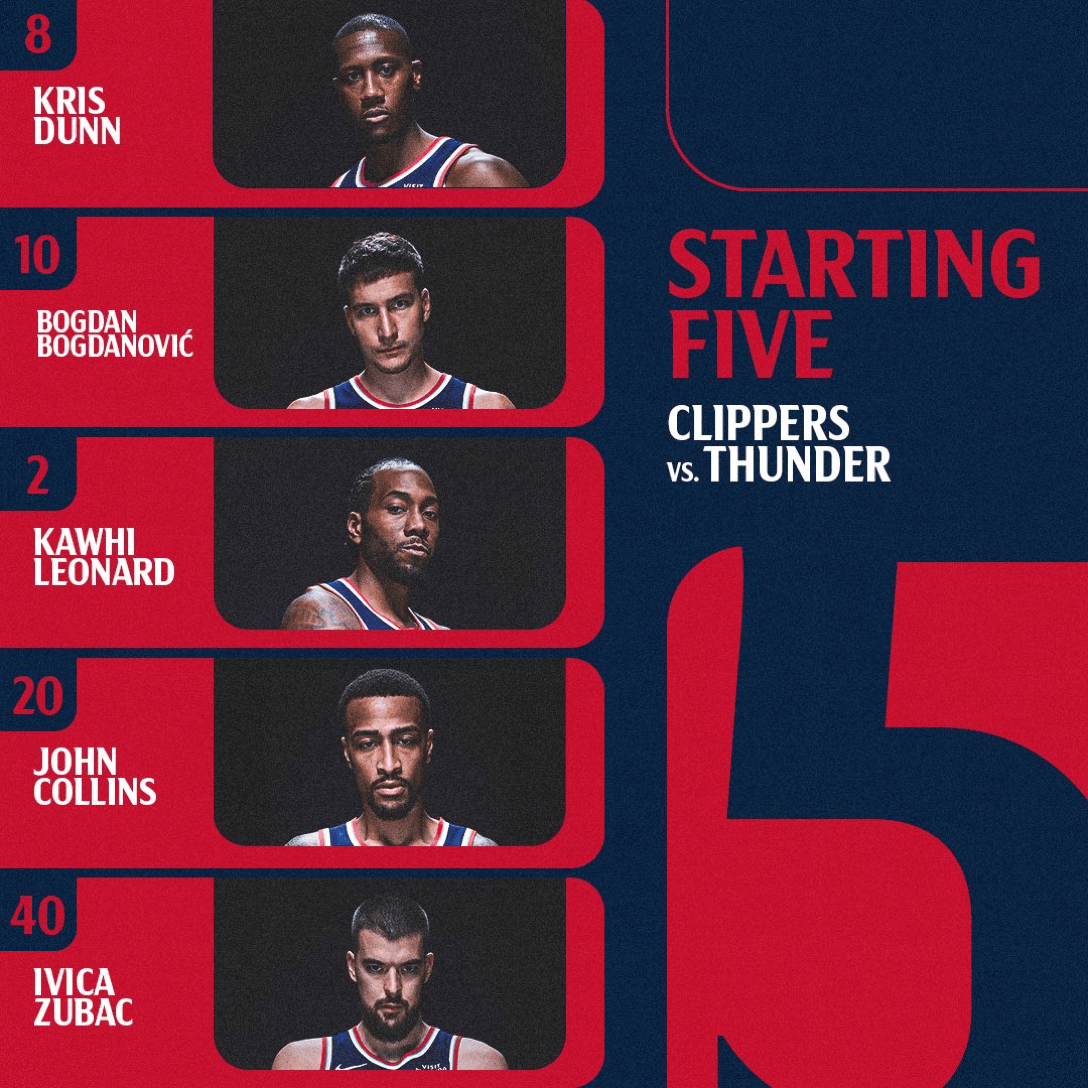 [流言板]快船首發(fā):鄧恩、波格丹諾維奇、倫納德、科林斯、祖巴茨