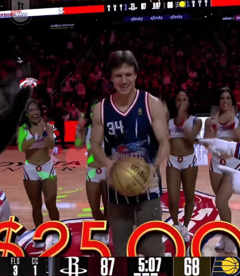 火箭官方分享動態(tài):火箭球迷投進中場三分贏得2.5萬美元獎金,如果是你中了2.5萬美元,你會怎么花?