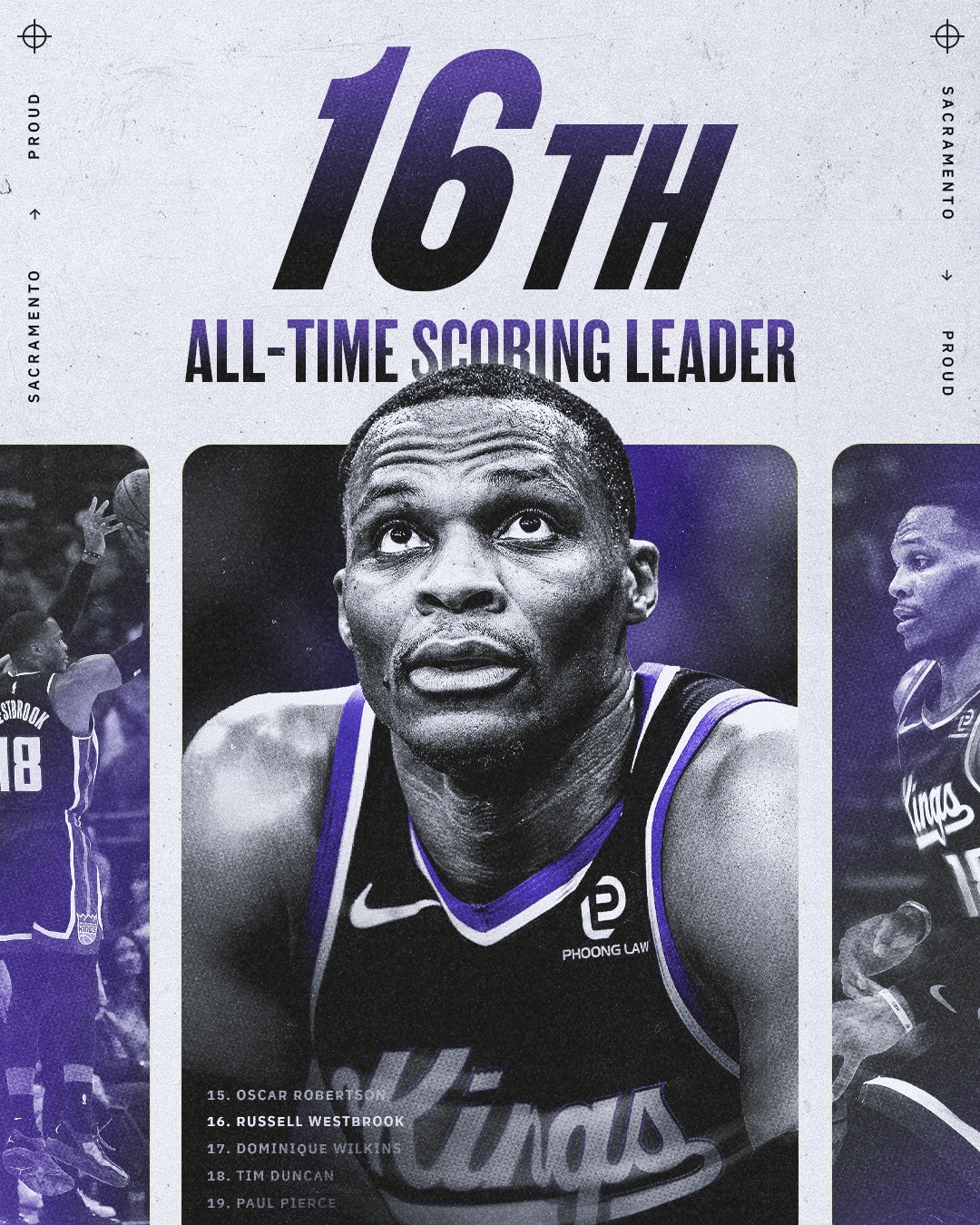 國王官方分享海報:威少生涯得到26672分,越威超越多米尼克-威爾金斯(26668分)升至歷史第十六位,爾金距離奧斯卡-羅伯特森(26710分)還差38分。至歷