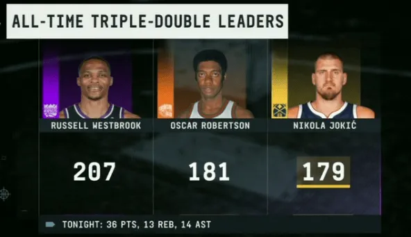 本場過后,約基奇職業(yè)生涯的三雙總數(shù)來到179次,距離歷史第二多的奧斯卡-羅伯特森只差兩場,距離歷史第一的拉塞爾-威斯布魯克還差28場。