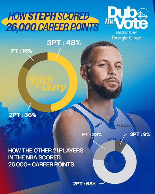今日,勇士官方曬出庫里26000分的組成:三分48%、兩分36%、罰球16%。
