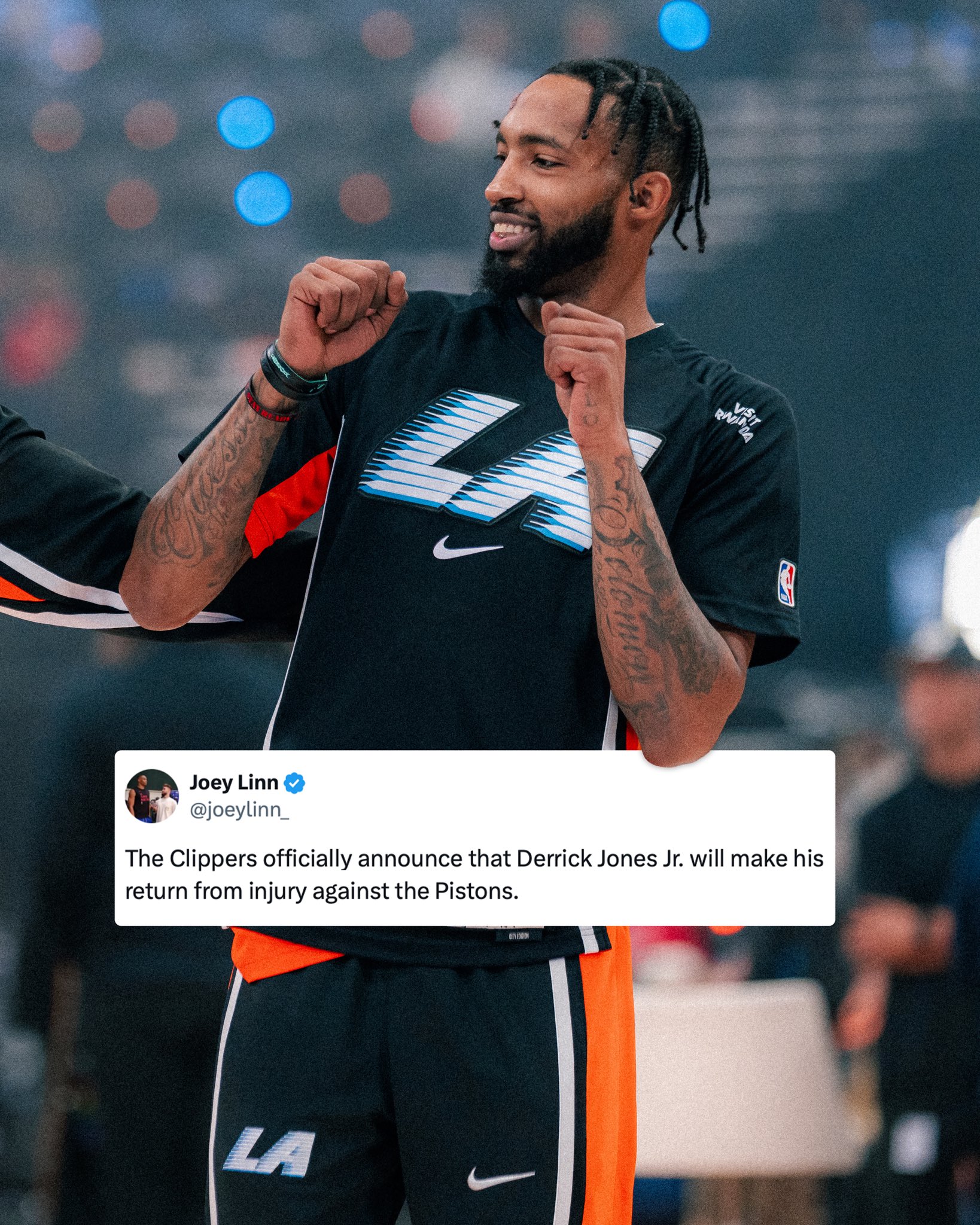 賽前,德里快船社媒更新球員動態(tài):小德里克-瓊斯會從傷病中回歸出席快船對陣活塞的板快比賽。