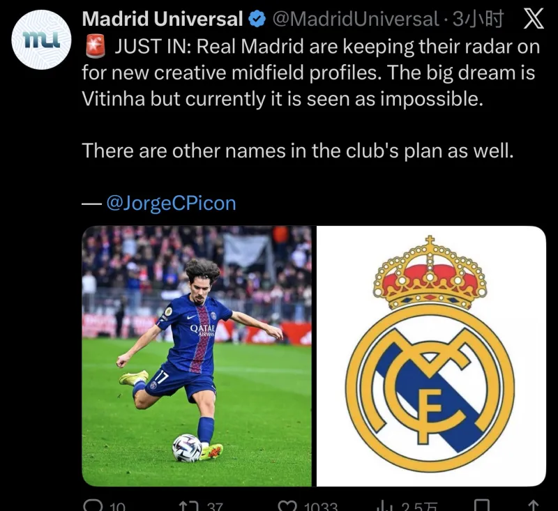 皇馬跟隊(duì)Picon::皇家馬德里仍在關(guān)注新的創(chuàng)意中場(chǎng)人選,他們的最大目標(biāo)是維蒂尼亞,但目前這筆簽約被認(rèn)為不可能實(shí)現(xiàn)。俱樂(lè)部的引援計(jì)劃中還有其他人選。