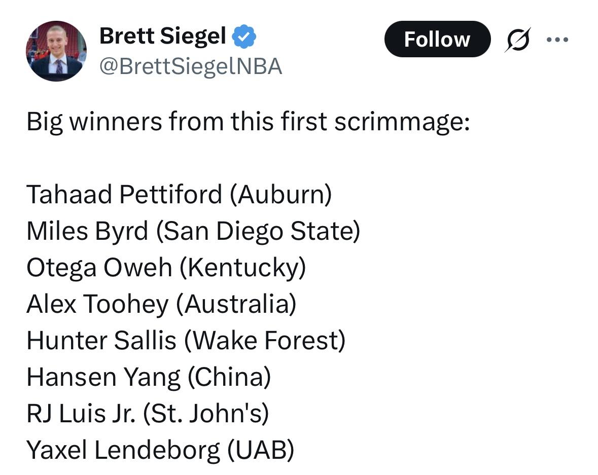 “首場(chǎng)5v5對(duì)抗賽中的大贏家:奧本大學(xué)的Tahaad Pettiford、圣地亞哥州立大學(xué)的Miles Byrd、肯塔基大學(xué)的Otega Oweh、澳大利亞的Alex Toohey、維克森林大學(xué)的Hunter Sallis、中國的楊瀚森、圣約翰大學(xué)的RJ Luis Jr.以及阿拉巴馬大學(xué)伯明翰分校的Yaxel Lendeborg?!?/p>