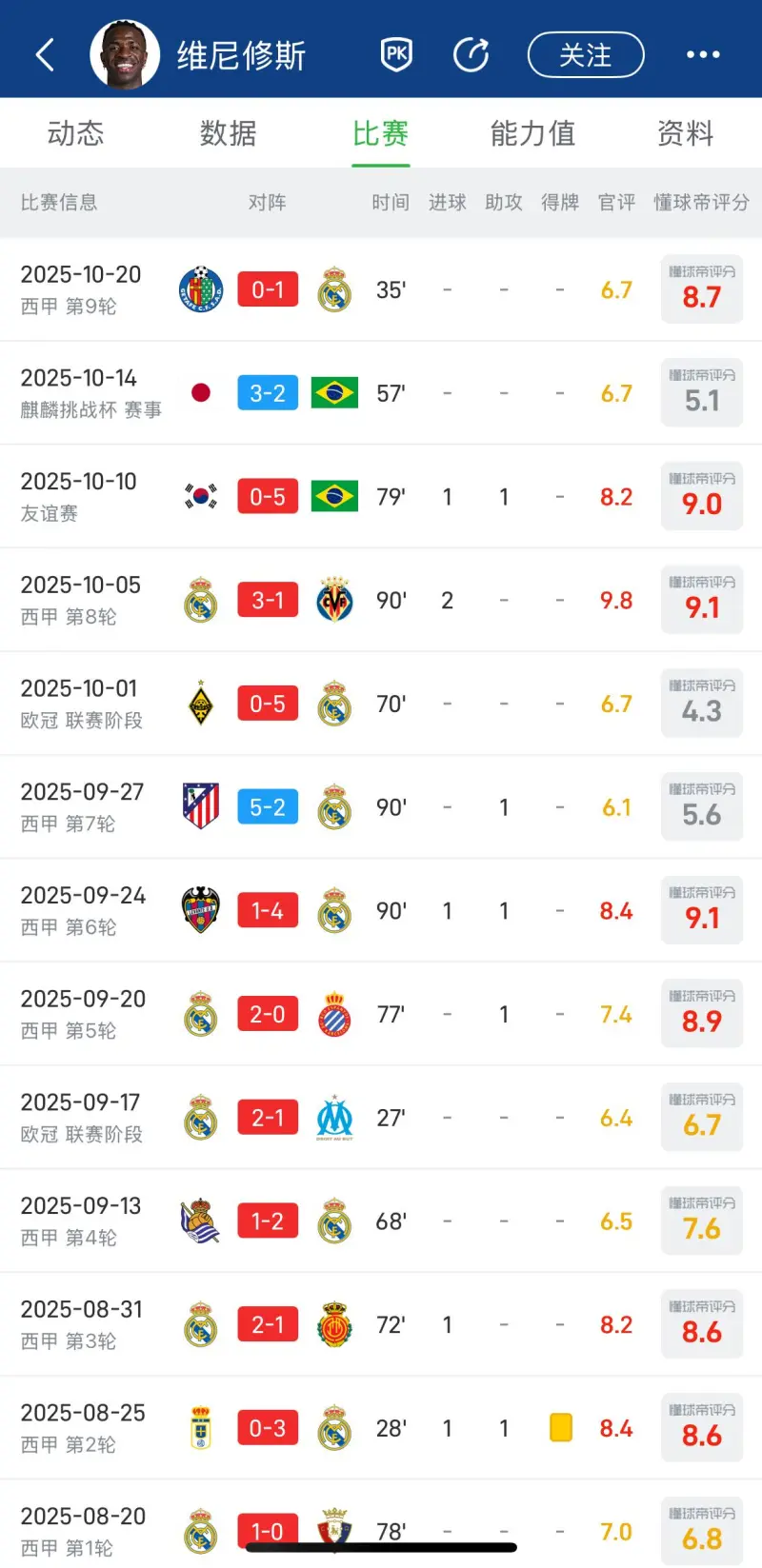 而通過截圖你們再看看維尼的出場時間,11場比賽踢滿90分鐘的比賽只有2場,其中替補(bǔ)3場。同時,馬斯坦脫諾8場首發(fā),只有1個進(jìn)球(還是維尼助攻),與此同時,羅德里戈也遭到打壓,被迫與維尼共享位置,請問這些是不是實(shí)際情況?這是不是阿隆索的錯誤?請不滿維尼的人回答我。