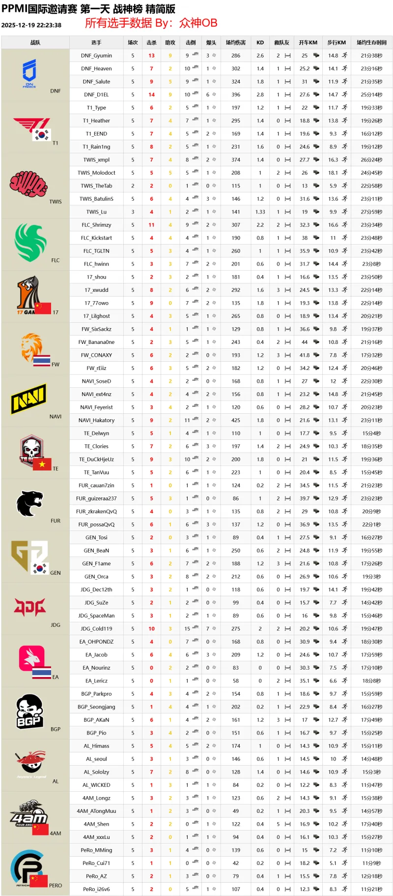 PPMI國(guó)際邀請(qǐng)賽 第一天 積分榜&戰(zhàn)神榜