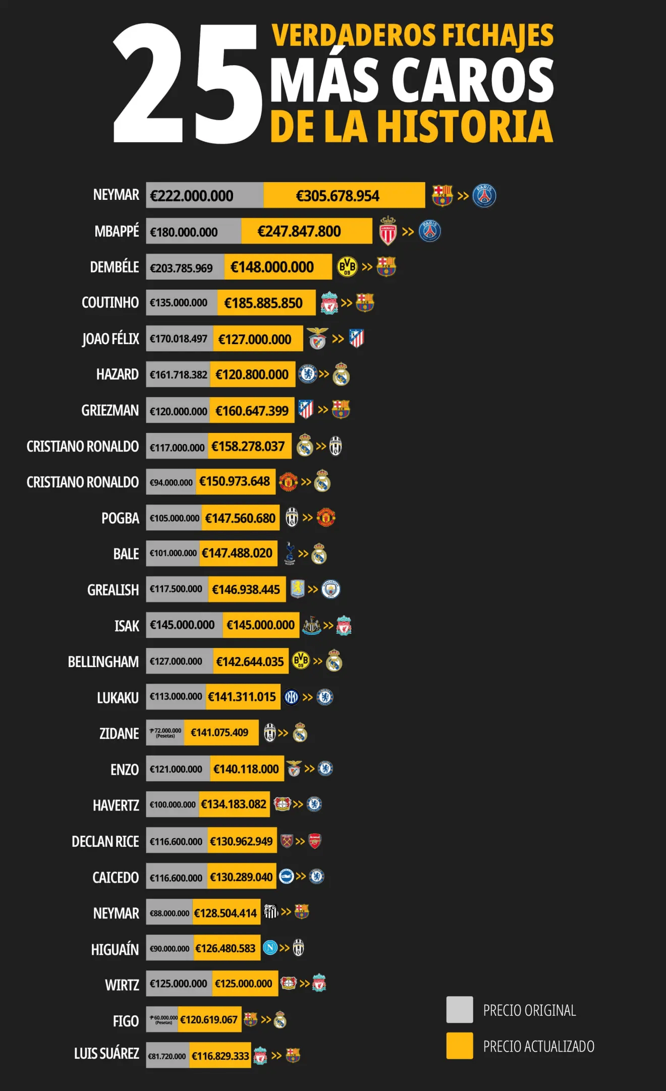 在這一算法下,部分近年的高價轉(zhuǎn)會排名明顯下滑。比如,伊薩克的交易折算為1.45億歐元,貝林厄姆約為1.27億歐元,均未能進入歷史前列。