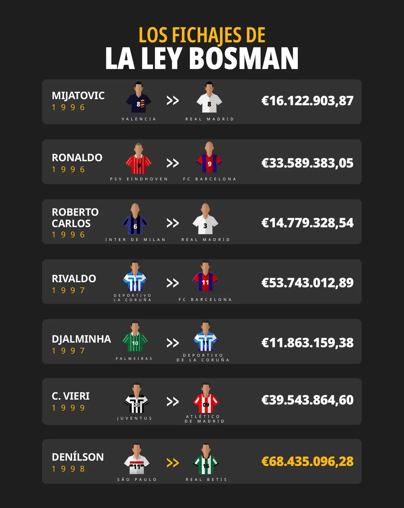相比之下,一些傳奇球星的“現(xiàn)價”則顯得頗為親民。里瓦爾多的轉(zhuǎn)會折算后約為5300萬歐元,德賈明哈僅約1200萬歐元;羅伯托-卡洛斯1996年以約660萬歐元加盟皇馬,按現(xiàn)價計算也僅約1400萬歐元。