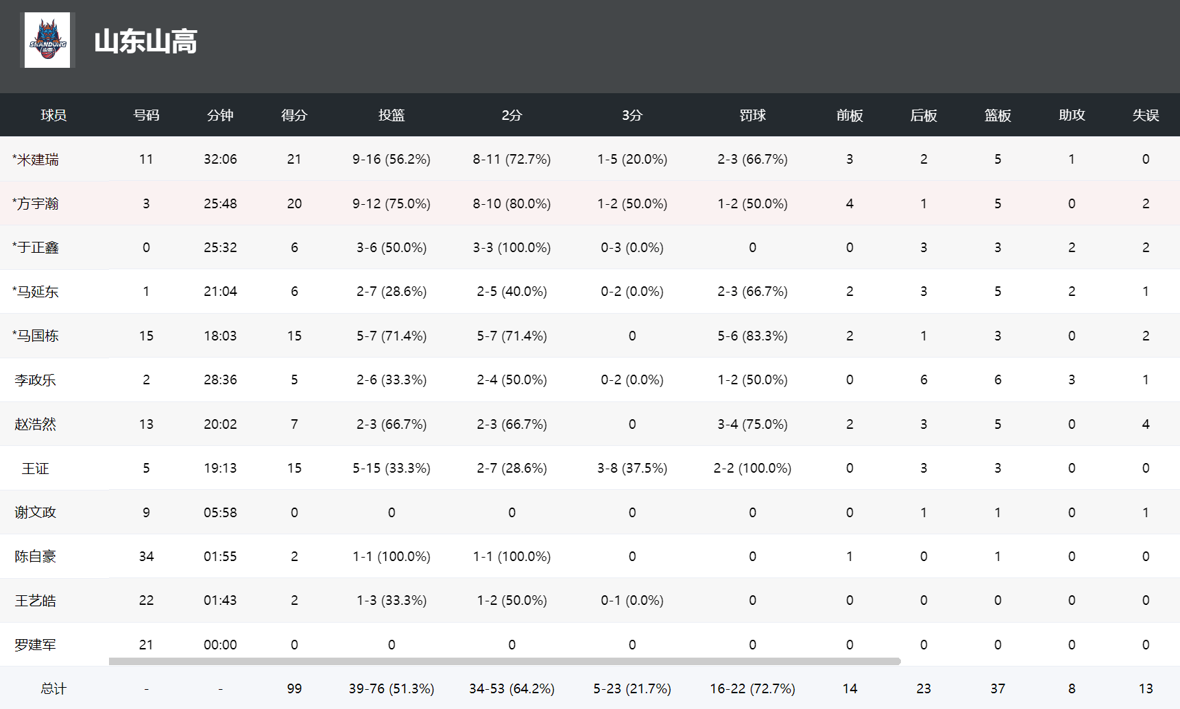山東:米建瑞21分、建瑞方宇瀚20分、分山王證15分。男籃