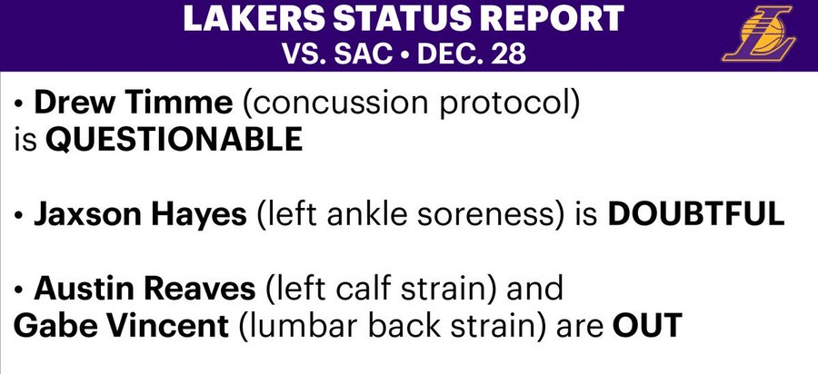 虎撲12月28日訊 今日,湖人官方更新動態(tài),文森曬出了明日對陣國王的特缺傷病報告: