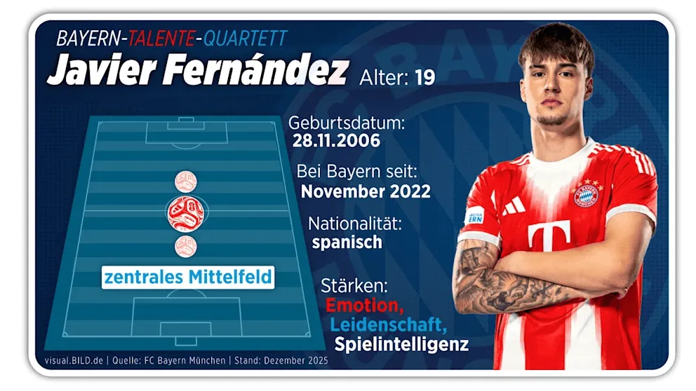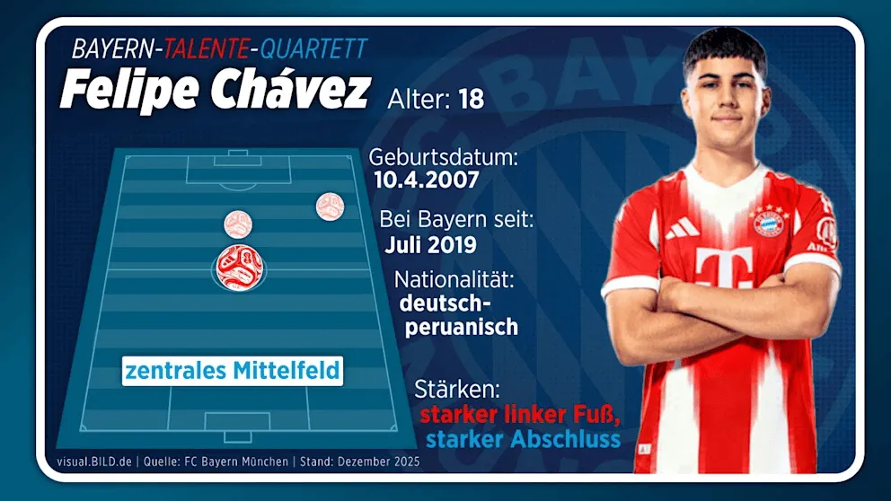 這位父親是秘魯人、母親是德國(guó)人的兒子,長(zhǎng)期以來一直是拜仁慕尼黑隊(duì)中最杰出的年輕射手之一:在2024/25賽季,他代表U19青年隊(duì)和拜仁二隊(duì)在各項(xiàng)賽事中貢獻(xiàn)了18粒進(jìn)球和13次助攻。
