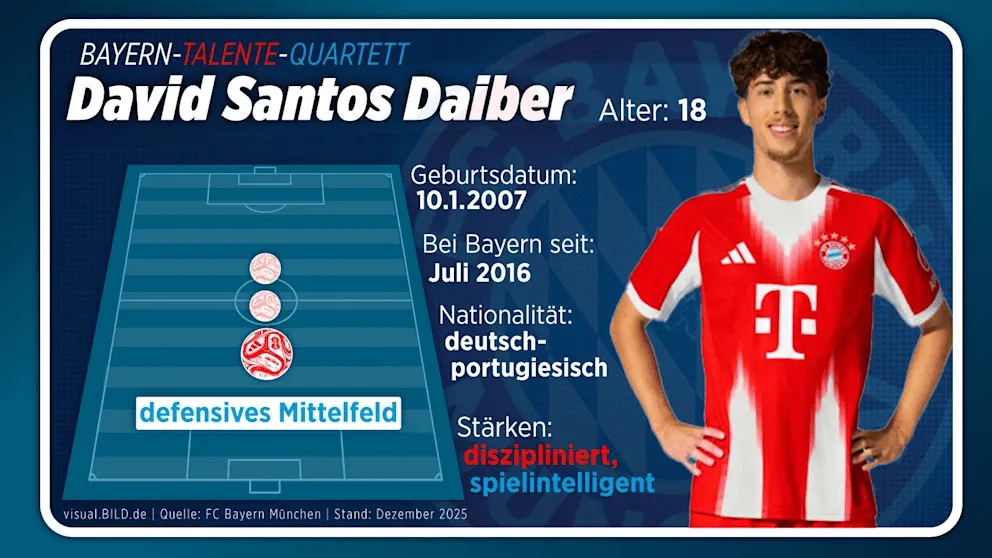 這位U19球員憑借其可靠勤奮的球風(fēng),贏得了近期在一線隊(duì)訓(xùn)練中的穩(wěn)定出場(chǎng)機(jī)會(huì),并入選了世俱杯陣容。他的球風(fēng)以精準(zhǔn)的傳球和巧妙的跑位為特點(diǎn)。這種自律精神在場(chǎng)下也同樣體現(xiàn):桑托斯·戴伯正在慕尼黑精英體育學(xué)??炭鄬W(xué)習(xí),備戰(zhàn)2026年的高中畢業(yè)考試。