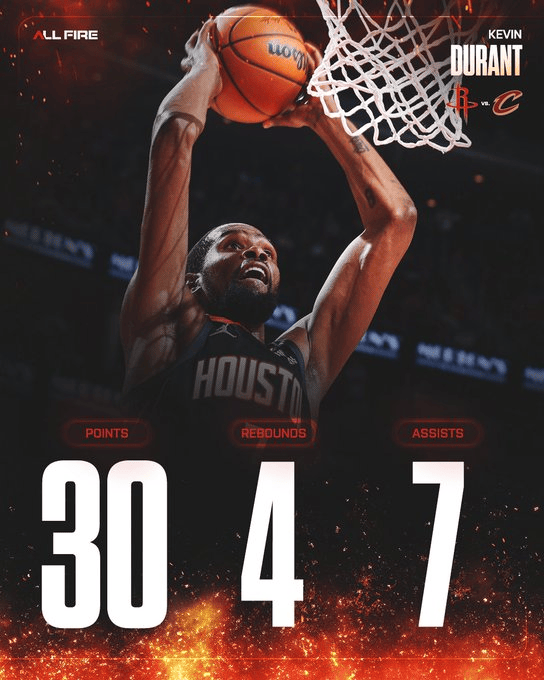賽后,火箭官方發(fā)布杜蘭特數(shù)據(jù)海報,全場得到30分4籃板7助攻。