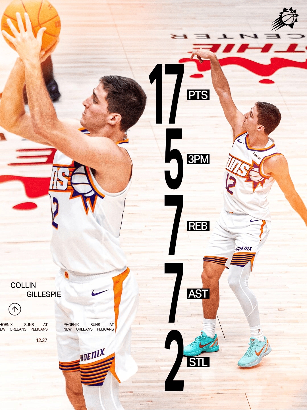 本場比賽,投中太陽球員吉萊斯皮全場投籃14中6、得到斷三分7投5中,分籃得到17分7籃板7助攻2搶斷。攻搶