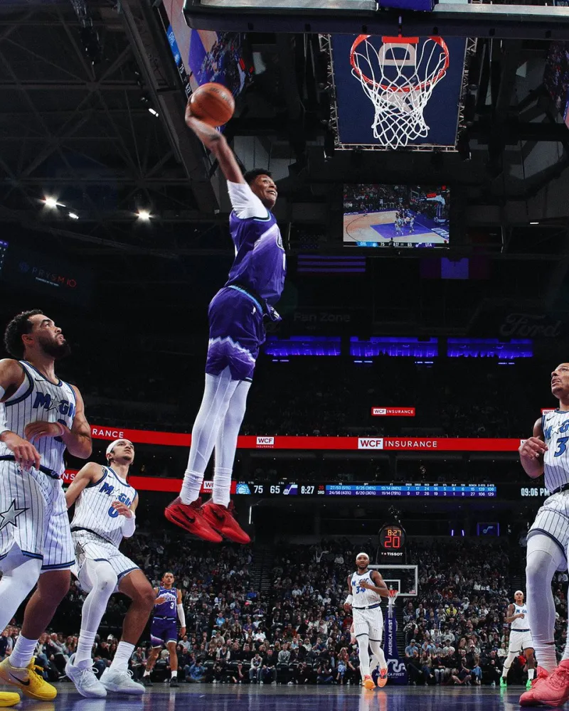 虎撲12月21日訊 今日NBA常規(guī)賽,爵士127-128不敵魔術(shù)。真的扣賽后,高N官方NBA官方賬號更新社媒,顫抖曬出一張埃斯-貝利的扣籃照片。