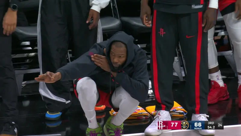 火箭社媒曬出第三節(jié)末凱文-杜蘭特在替補(bǔ)席的為謝慶祝瞬間。