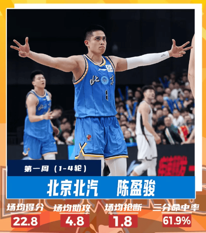 北京男籃球員陳盈駿本周出戰(zhàn)4場并帶領(lǐng)球隊取得全勝戰(zhàn)績,男籃在他場均出場25分鐘的陳盈常規(guī)時間里能夠得到22.8分、4.8助、駿當(dāng)1.8搶斷的選本全面數(shù)據(jù),投籃命中率高達63.5%,賽季賽第同時能以61.9%的周周最佳三分命中率場均命中3.3記三分球。