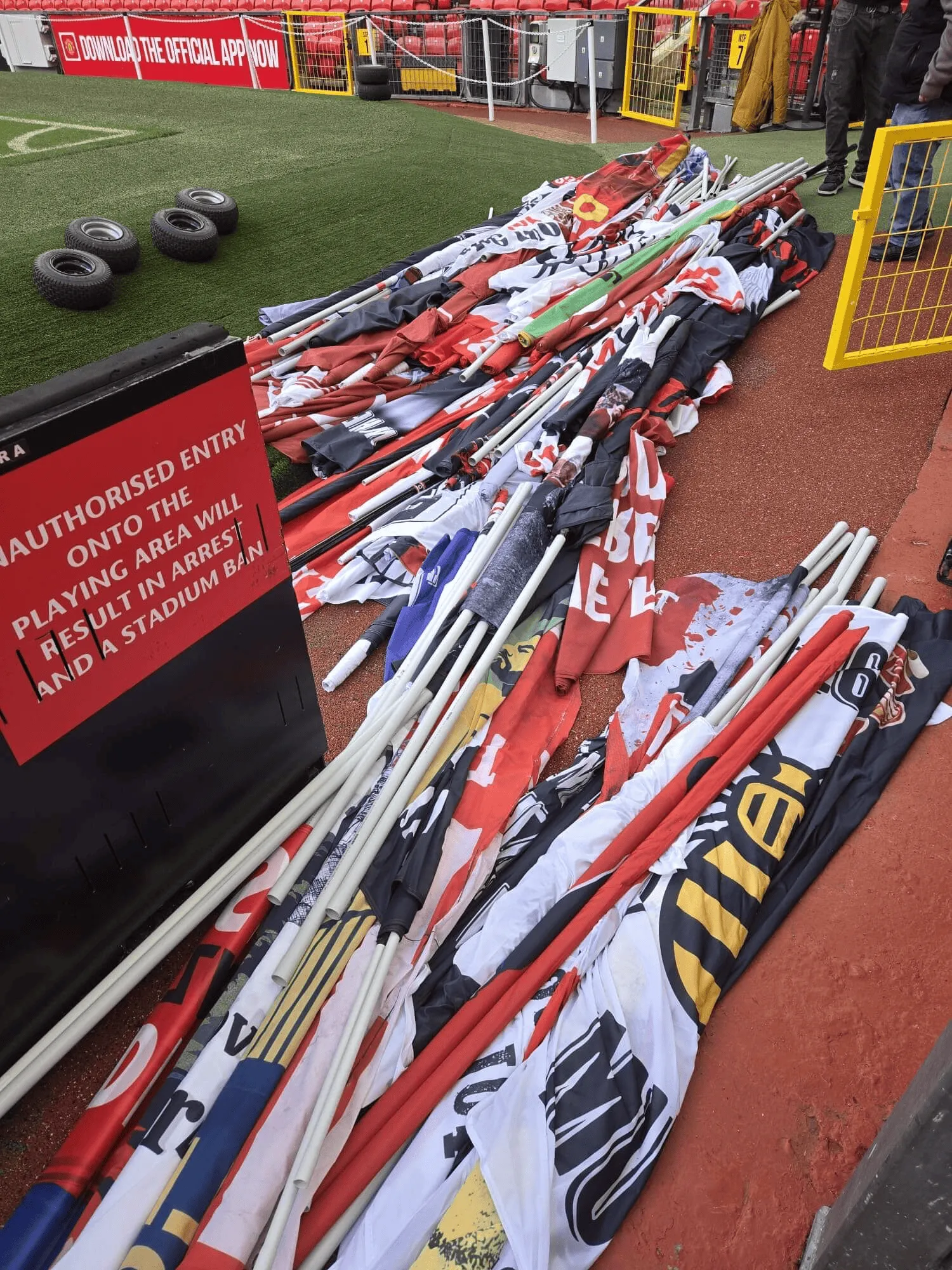 曼聯(lián)球迷組織“Red Army”以其獨(dú)立性而自豪,但他們與俱樂(lè)部之間建立了信任關(guān)系。為了允許他們使用例如由兩根旗桿支撐的2x3米旗幟,俱樂(lè)部特意豁免了一些規(guī)定。此舉取得了成功,此后橫幅的數(shù)量有所增加。