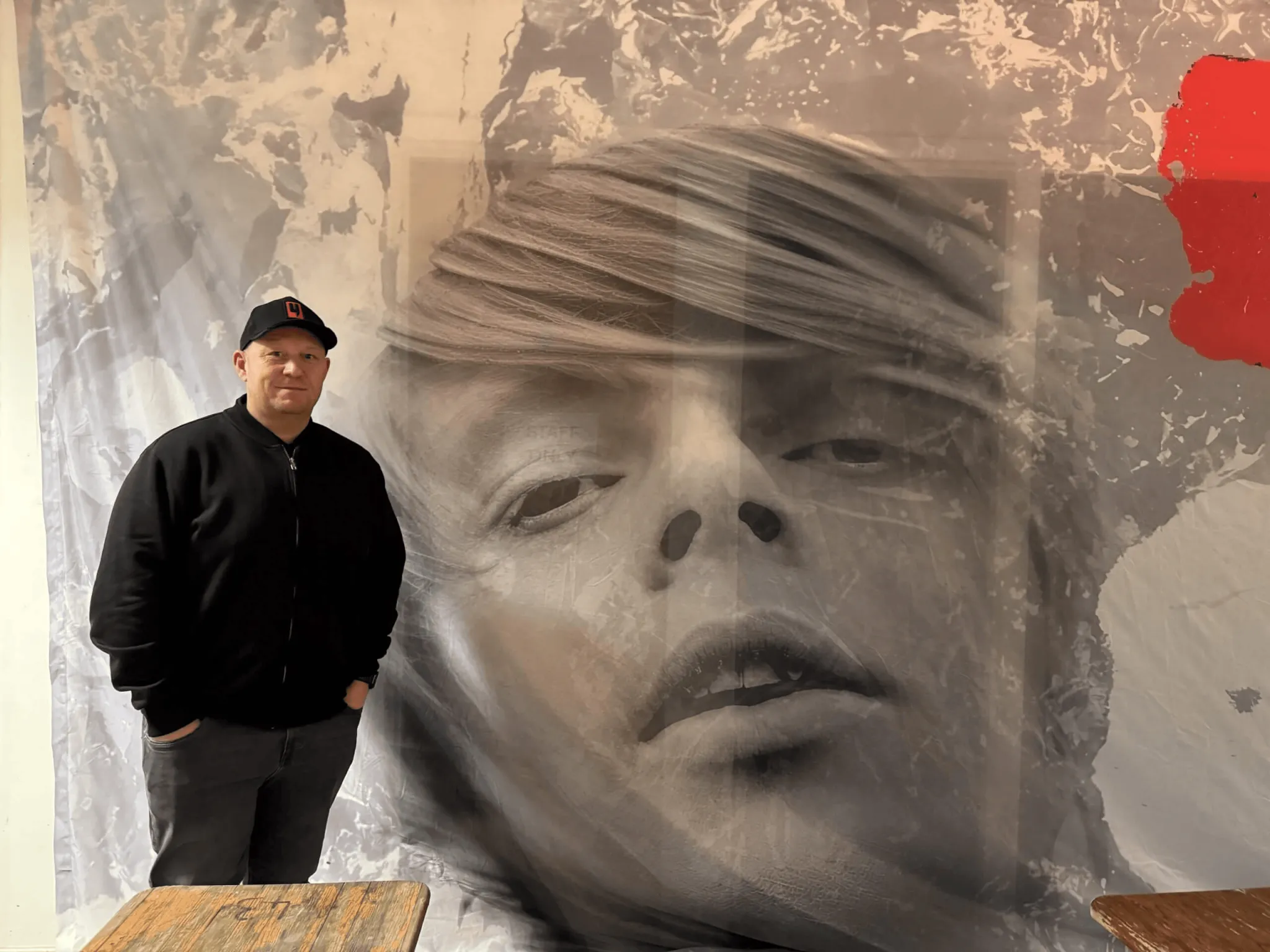 在對(duì)陣西漢姆聯(lián)隊(duì)比賽前,大約200到300名“紅軍”成員聚集在那里,最顯眼的位置掛著一面旗幟,旗幟上印著曼徹斯特音樂(lè)家加里·“馬尼”·蒙菲爾德(Gary ‘Mani’ Mounfield)的頭像。