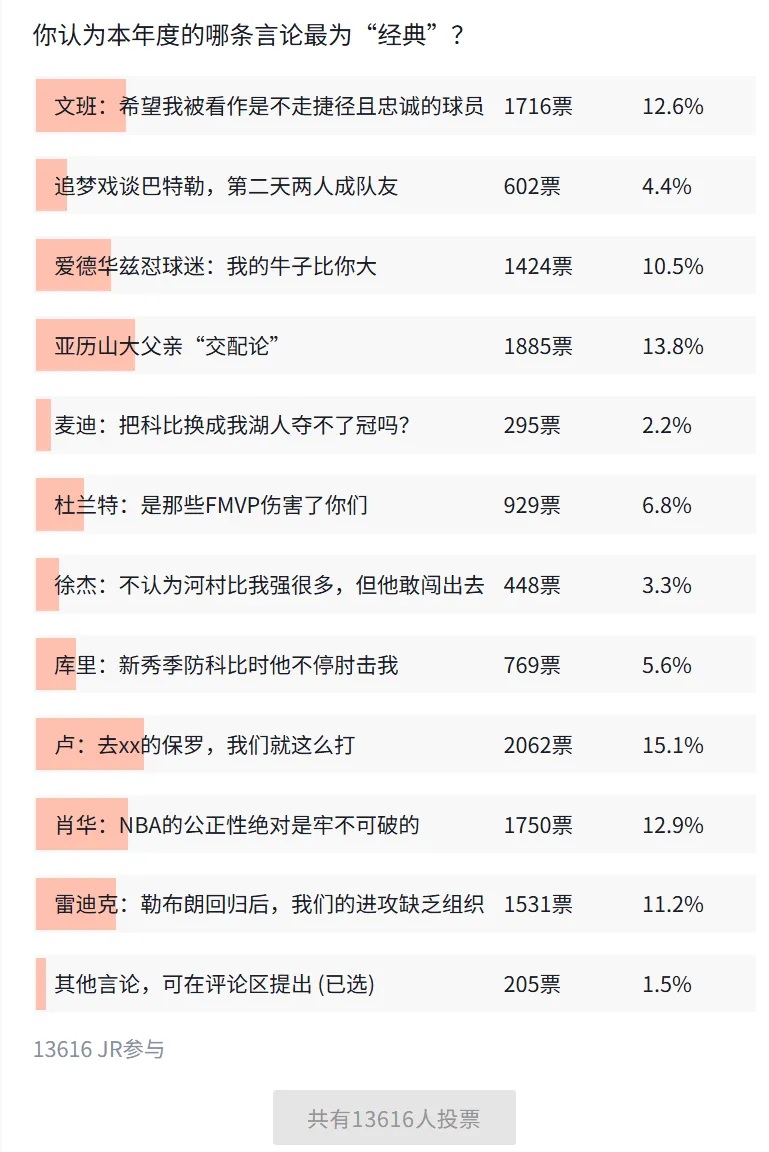 本次年度最經(jīng)典言論的評(píng)選已經(jīng)結(jié)束,共有13616人投票,最終“泰倫-盧噴保羅:‘去xx的保羅”言論以15.1%的得票率險(xiǎn)勝當(dāng)選: