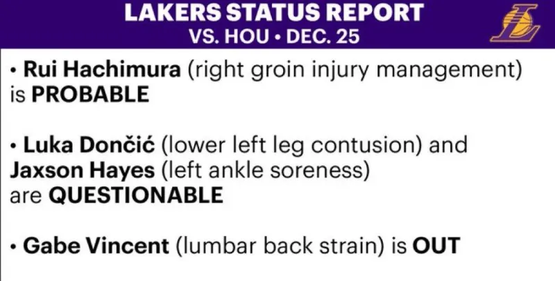 湖人傷病報告(當(dāng)?shù)貢r間12月25日對陣火箭)