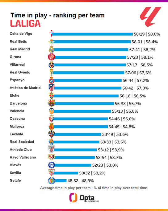 巴薩的馬分秒巴秒凈比賽時間為55分38秒,排名西甲第十