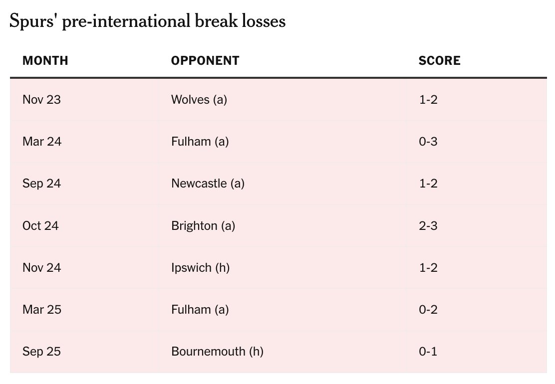 據(jù)TA統(tǒng)計,際比熱刺隊在過去七次國際比賽日之前的賽日英超聯(lián)賽中均告失利,這一糟糕記錄甚至可以追溯到2023年。前英